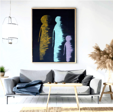In a quiet corner of the universe, three ethereal spirits danced across the canvas of the night sky, each leaving a trail of vibrant color in their wake. The first, a gentle lavender, whispered secrets of the dawn, while the second, a serene teal, sang of the ocean's depths. The third, a warm amber, carried the stories of ancient forests. Together, they wove a tapestry of dreams, a fleeting masterpiece that would vanish with the first light of day, leaving only the memory of their celestial ballet. This intriguing original painting explores the human form through a minimalist and evocative lens. The artist renders three stylized figures in soft, muted hues of yellow, teal, and purple, creating a sense of ethereal presence and fleeting memory.